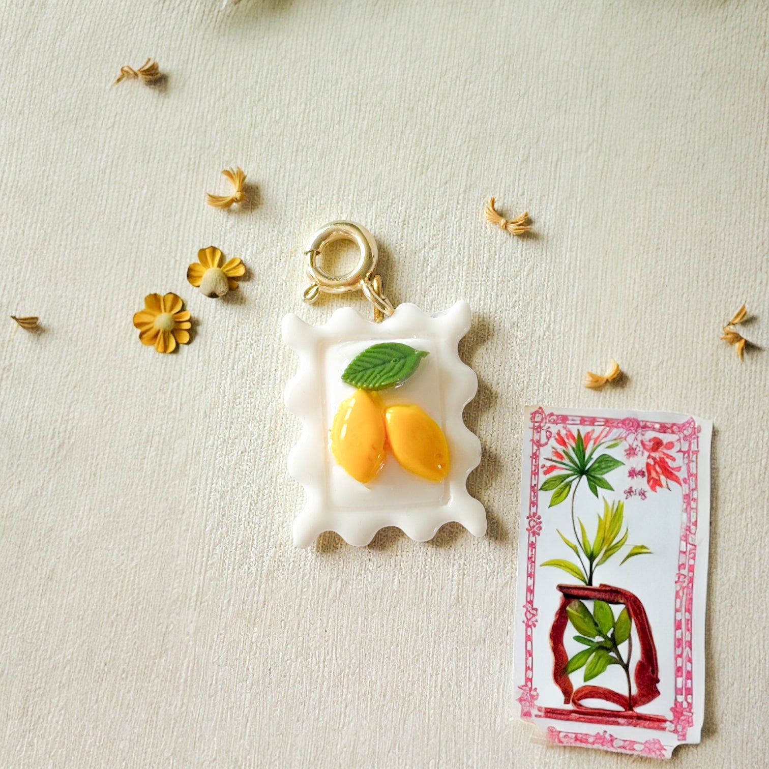 Un charm en forme de timbre, décoré de petits citrons 🍋✨ Parfait pour ajouter une touche fraîche et lumineuse à ton collier, ta chaîne ou ton bracelet.