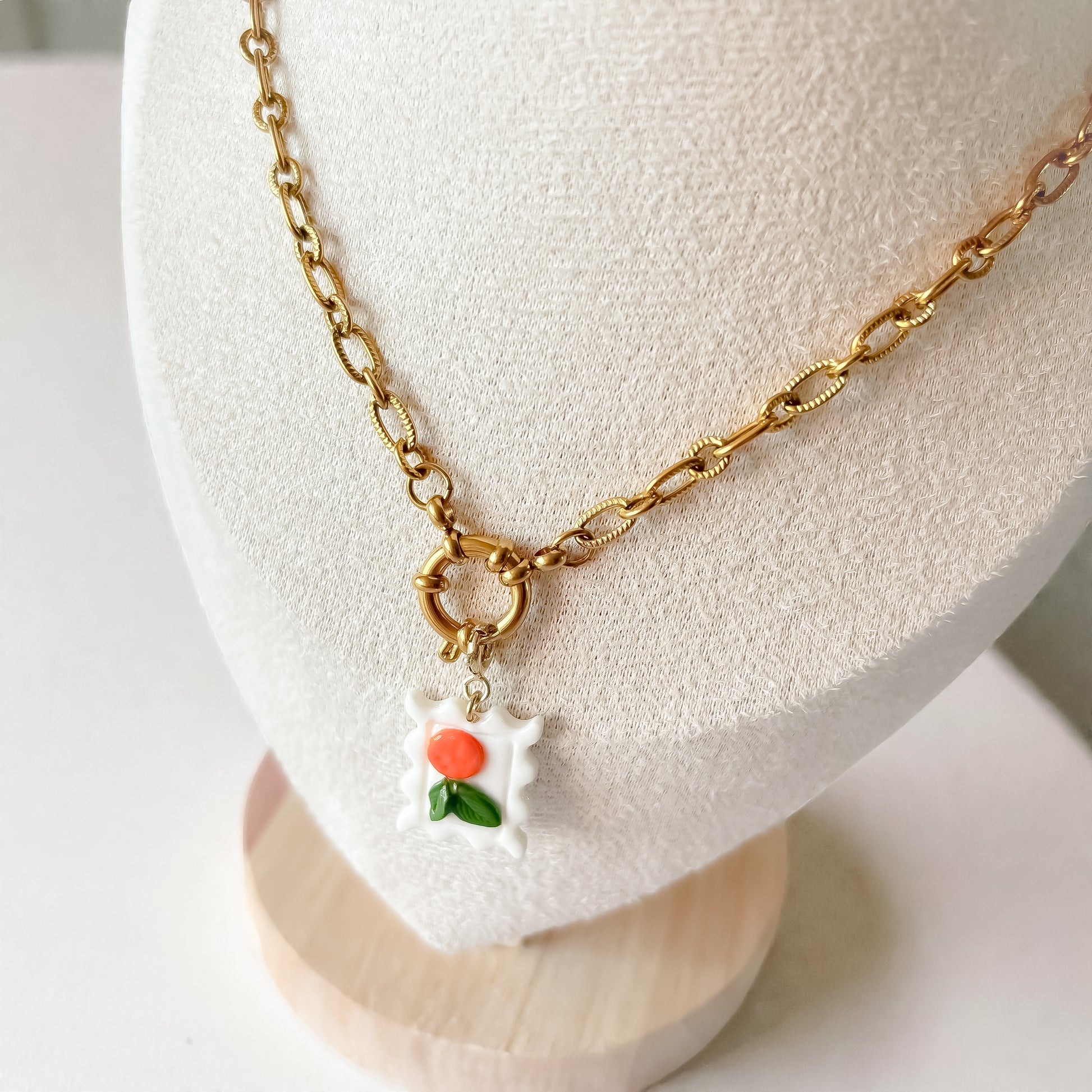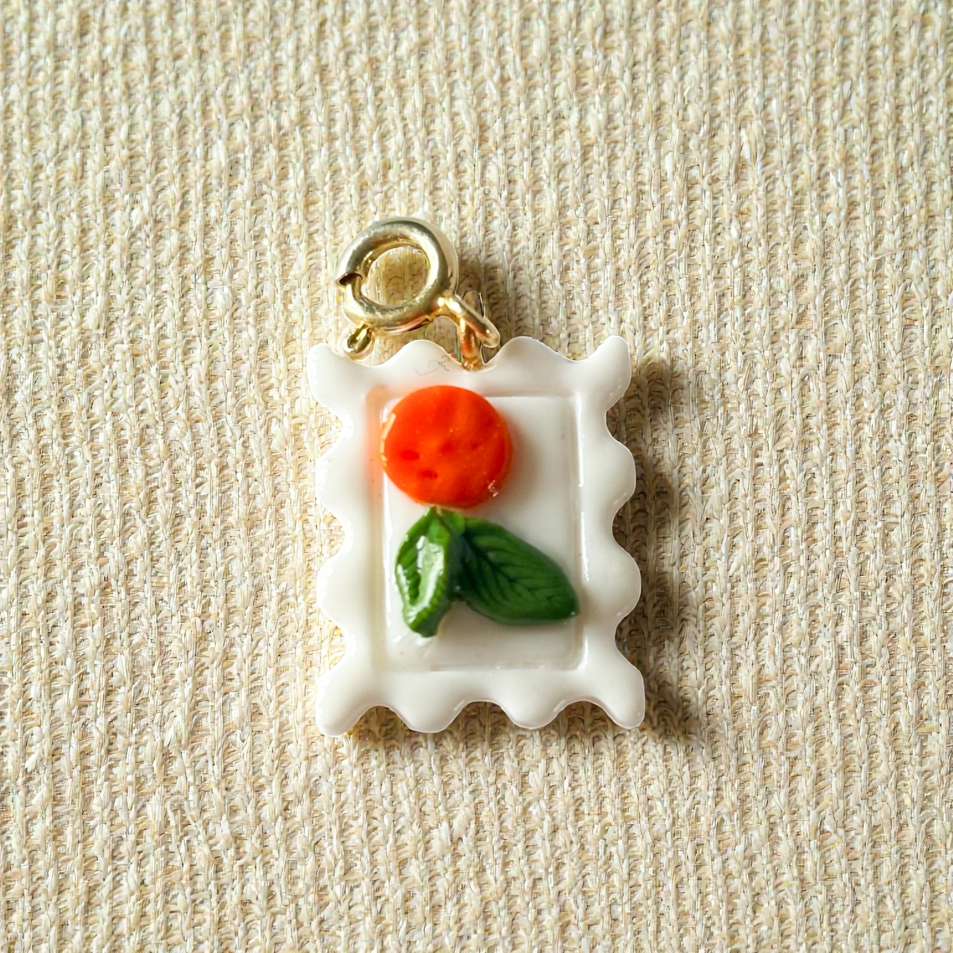 Un charm en forme de timbre, décoré de petites oranges ✨ Parfait pour ajouter une touche fraîche et lumineuse à ton collier, ta chaîne ou ton bracelet.