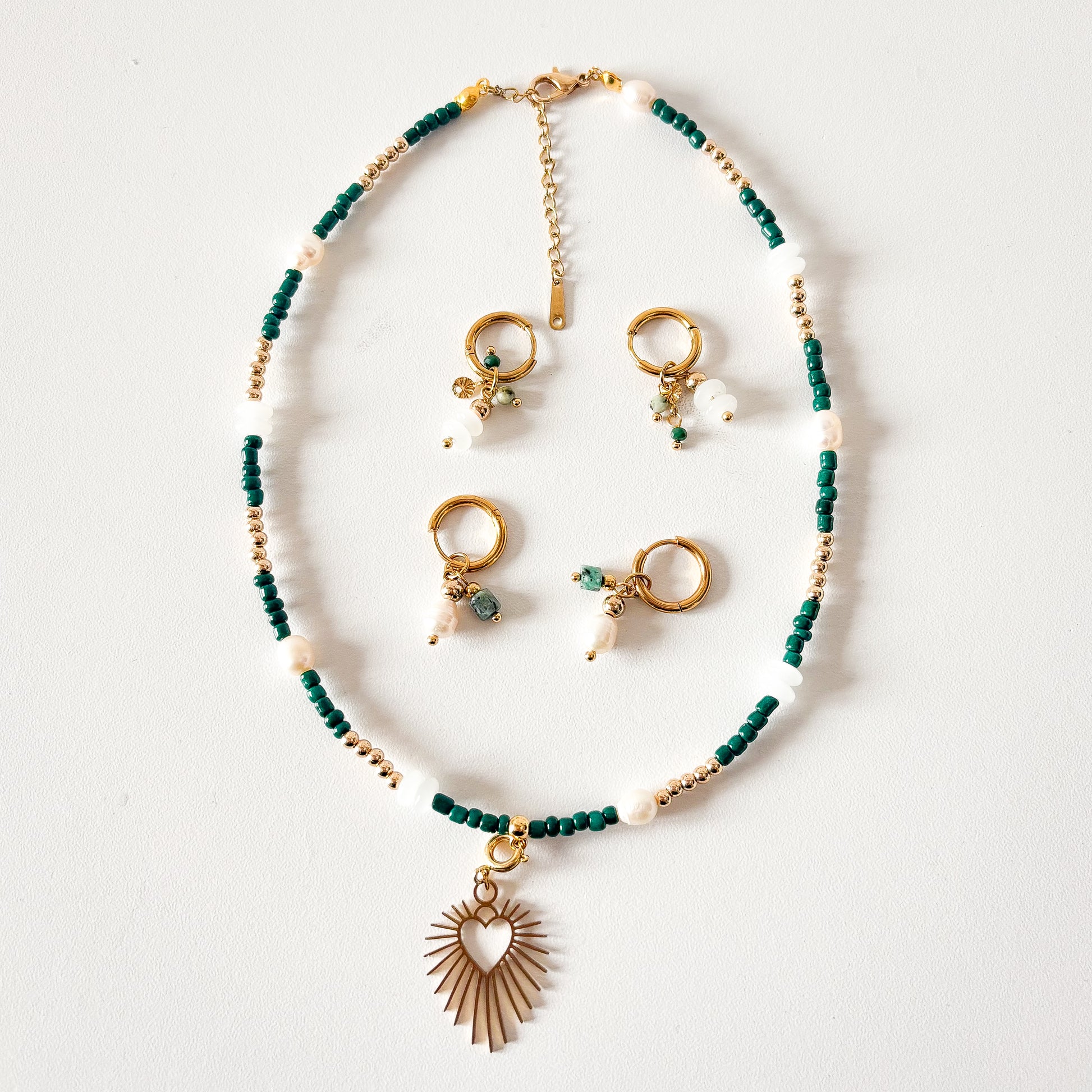 Célébrez votre signe astrologique avec ce collier talisman dédié aux natives et natifs du Taureau. Conçu avec des perles vertes et dorées et des perles en verre blanches, il se distingue par son pendentif cœur Ex Voto, symbole d’amour, de stabilité et de protection, parfaitement en accord avec la nature sensuelle et déterminée de ce signe de terre.